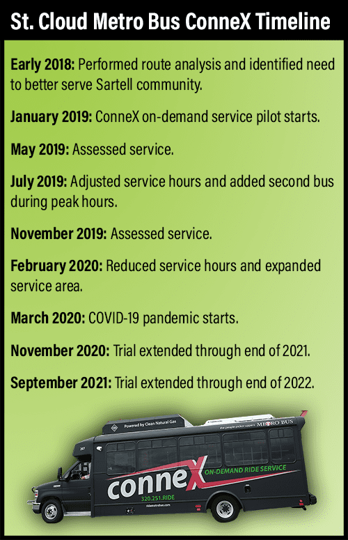 “Metro Bus started ConneX in response to ridership and access concerns on a fixed route that served Sartell,” said Green. “The city is difficult to serve with a fixed route because of the spread of housing, lack of connecting streets and the fact that it is divided by a river.”
